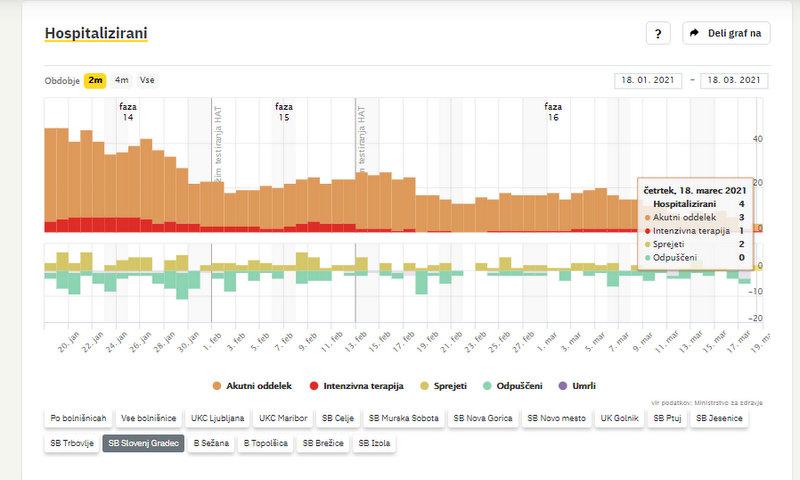 Po podatkih Sledilnika za covid-19 se v Splošni bolnišnici Slovenj Gradec zdravijo 4 covidni bolniki, od teh potrebuje intenzivno nego. Na novo so v bolnišnico sprejeli dva covidna bolnika, v domačo oskrbo pa niso odpustili nobene osebe.