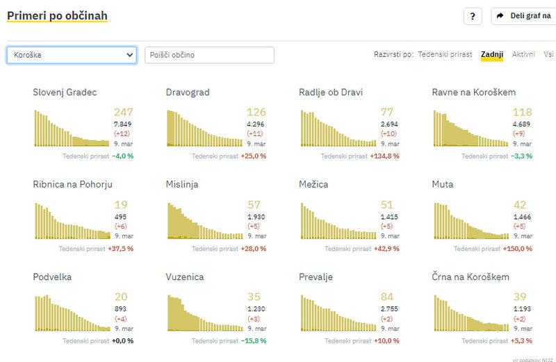 Na Koroškem o včeraj potrdili 74 novih okužb. V Slovenj Gradcu so jih zabeležili 12, v Dravogradu 11, v Radljah ob Dravi 10, na Ravnah na Koroškem 9, v Ribnici na Pohorju 6, v Mislinji, Mežici in na Muti po 5, v Podvelki 4, v Vuzenici 3, na Prevaljah in v Črni na Koroškem pa po 2.