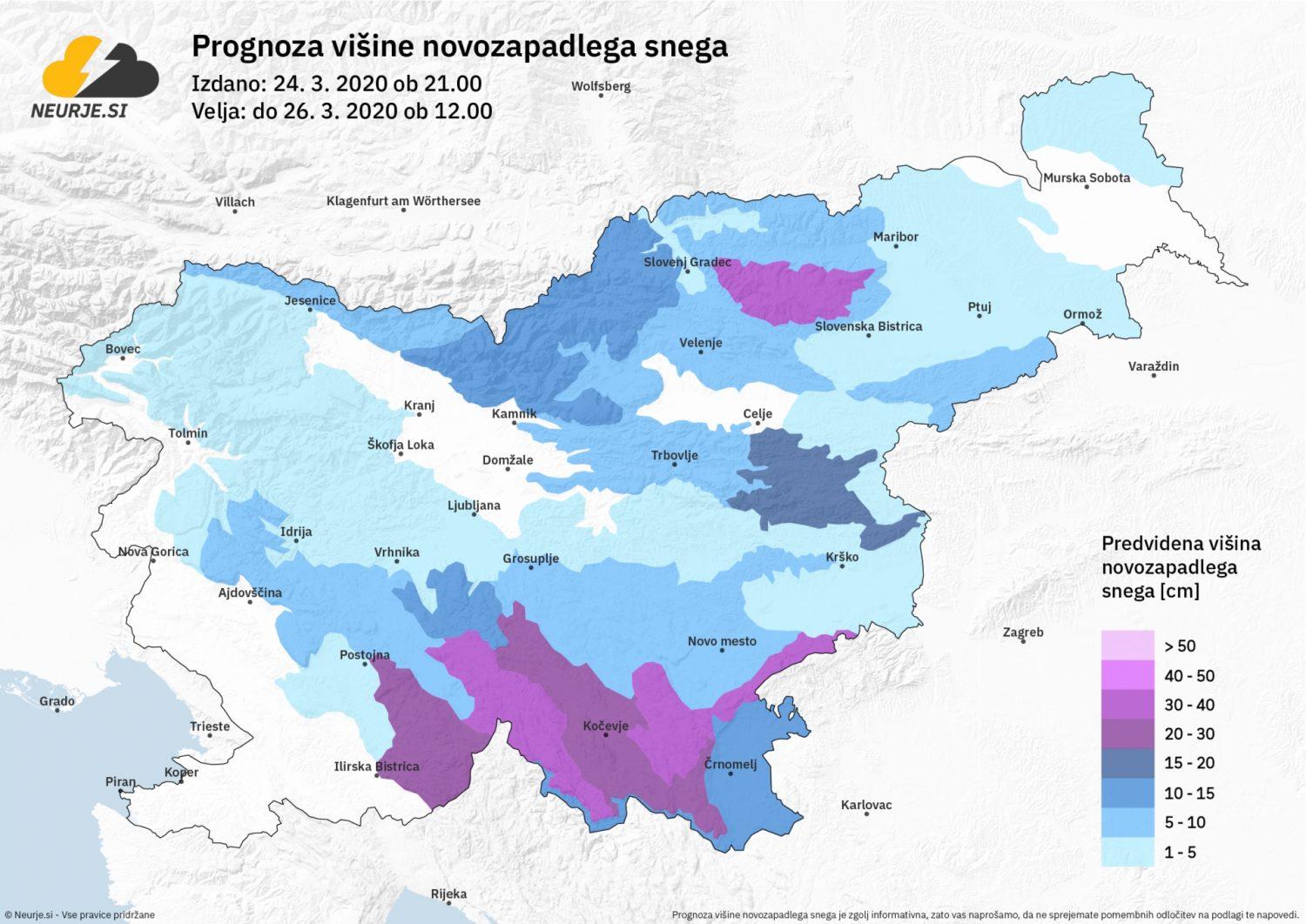 Do četrtka dopoldan bo ponekod v hribovitih krajih jugovzhodne Slovenije in na območju Pohorja zapadlo od 25 do 40 cm suhega snega. Od 10 do 20 cm snega lahko zapade tudi v nekaterih izpostavljenih krajih na Koroškem, Kozjanskem in na območju Kamniško Savinjskih Alp. Do 10 cm novega snega lahko zapade tudi na območju Haloz, Posavskega hribovja, Zasavja, v okolici Šaleške doline in drugod na Koroškem. Drugod po Sloveniji bo snežna odeja debela največ 5 cm. Čez dan se bodo temperature po nižinah namreč dvignile malenkost nad ledišče, zato se bo sneg, ki bo zelo suh, s težavo oprijemal tal. Snežna odeja se bo po nižinah nabirala v glavnem v nočnem in jutranjem času.
