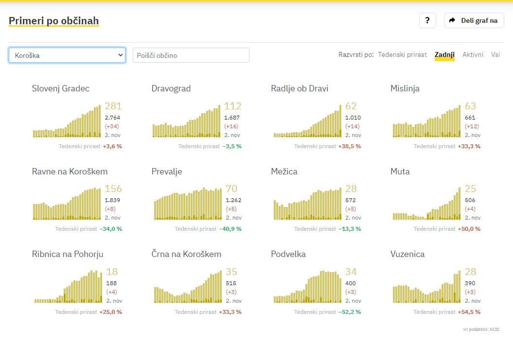 Na Koroškem so v torek nove okužbe potrdili v vseh občinah. Največ v Slovenj Gradcu, kjer so jih zabeležili 34, v Dravogradu 16, v Radljah ob Dravi 14, v Mislinji 12, na Ravnah na Koroškem 8, na Prevaljah in v Mežici po 5, na Muti in v Ribnici na Pohorju po 4, v Črni na Koroškem, v Podvelki in Vuzenici pa po 3.