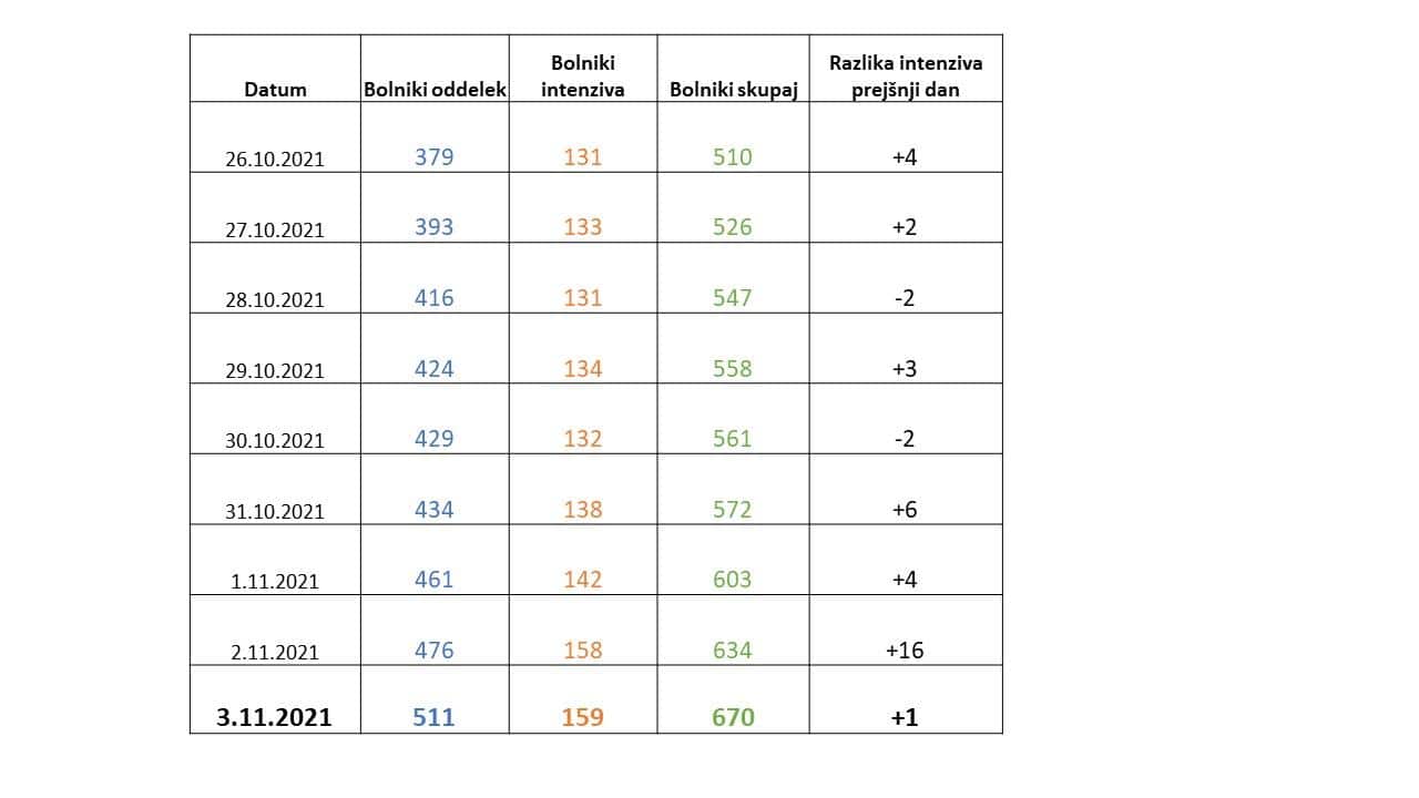 V bolnišnicah po podatkih vlade zdravijo 670 covidnih bolnikov, 36 več kot dan prej, od tega 159 na intenzivni negi, dan pred tem so jih 158. V bolnišnice je bilo sprejetih kar 99 ljudi, umrlo je 18 bolnikov. Najmlajši bolnik s covidom-19 je star 19 let, na intenzivni negi pa kot najmlajšega zdravijo 21-letnika.