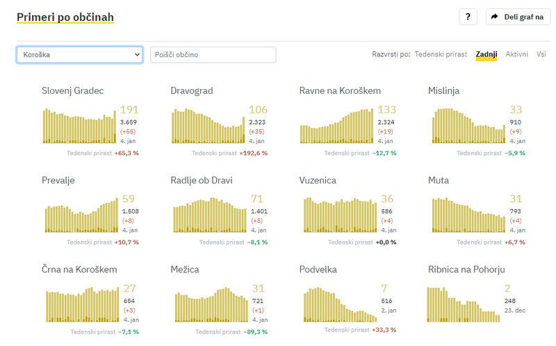 Na Koroškem so včeraj potrdili novih okužb. Največ v Slovenj Gradcu, kjer so jih zabeležili 55, v Dravogradu 35, na Ravnah na Koroškem 19, v Mislinji 9, na Prevaljah 8, v Radljah ob Dravi 5, v Vuzenici in na Muti po 4, v Črni na Koroškem 3, v Mežici 1.