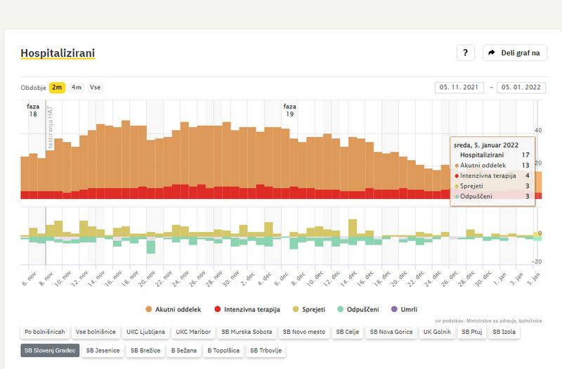 Po podatkih sledilnika v SB Slovenj Gradec zdravijo 17 covidnih bolnikov. Od teh 4 potrebujejo intenzivno zdravljenje. V domačo oskrbo so odpustili 3 osebe, 3 pa so na novo sprejeli v bolnišnico.