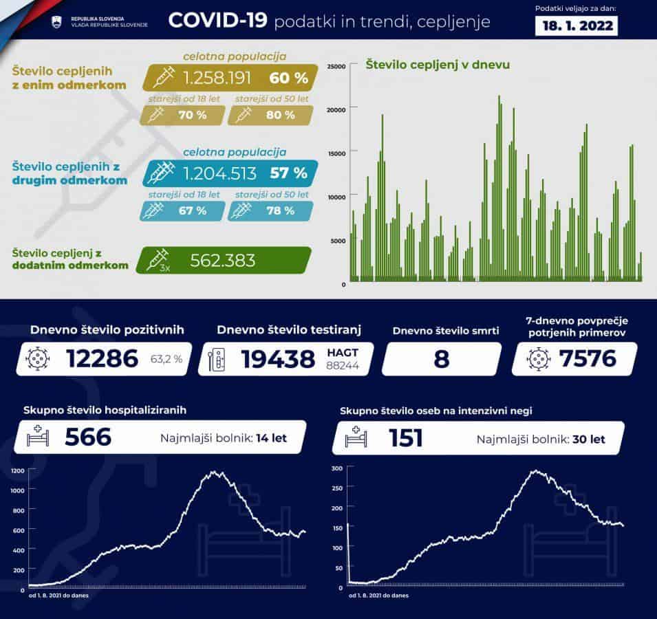 V torek so v Sloveniji ob opravljenih 19.438 PCR-testih potrdili 12.286 okužb z novim koronavirusom, dan pred tem so ob opravljenih 13.803 PCR-testih potrdili 8681 okužb. Delež pozitivnih PCR-testov je v torek znašal 63,2 odstotka, dan pred tem je bil 62,89–odstoten. Včeraj so opravili tudi 88.244 hitrih testov, katerih pozitivne rezultate preverjajo še s PCR-testi, dan pred tem 111.960.