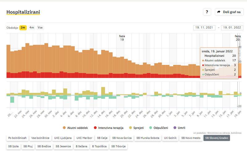Po zadnjih podatkih vlade v bolnišnicah zdravijo 566 covidnih bolnikov, dan prej 575, od tega 151 na intenzivni negi, dan prej 155. V torek je umrlo 8 covidnih bolnikov. Po podatkih sledilnika v SB Slovenj Gradec zdravijo 20 covidnih bolnikov. Od teh 3 potrebujejo intenzivno zdravljenje. Na novo so v bolnišnico sprejeli 2 osebi, 2 so odpustili v domačo oskrbo.