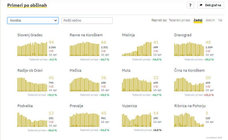 Na Koroškem so v torek potrdili nove okužbe v devetih občinah, skupaj 29. Največ so jih zabeležili v Slovenj Gradcu, in sicer 9. Na Ravnah na Koroškem 5, v Mislinji 3, v Dravogradu, Radljah ob Dravi, Mežici, na Muti, v Črni na Koroškem in v Podvelki pa po dve, kažejo podatki Sledilnika za Covid-19.