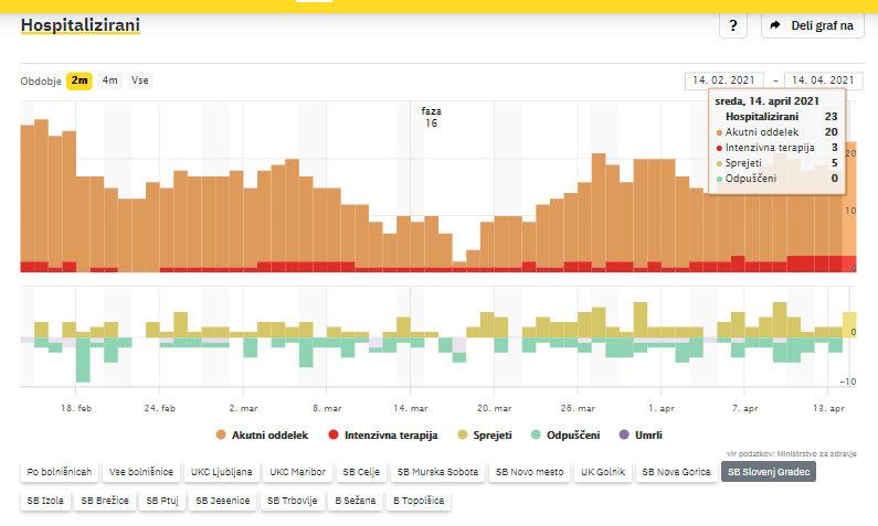 V SB Slovenj Gradec zdravijo 23 covidnih bolnikov, od tega 3 potrebujejo intenzivno nego, na novo so v bolnišnico sprejeli 5 covidnih bolnikov, v domačo oskrbo pa niso odpustili nobene osebe.