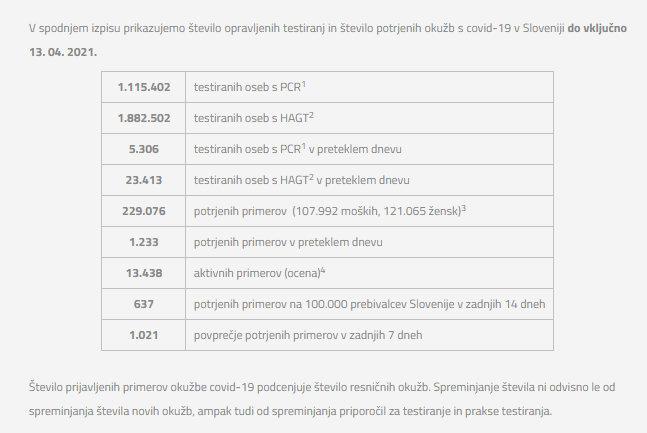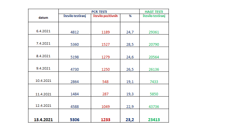 Število opravljenih testiranj in število potrjenih okužb s covid-19 v Sloveniji do vključno 13. 04. 2021. Foto: NIJZ