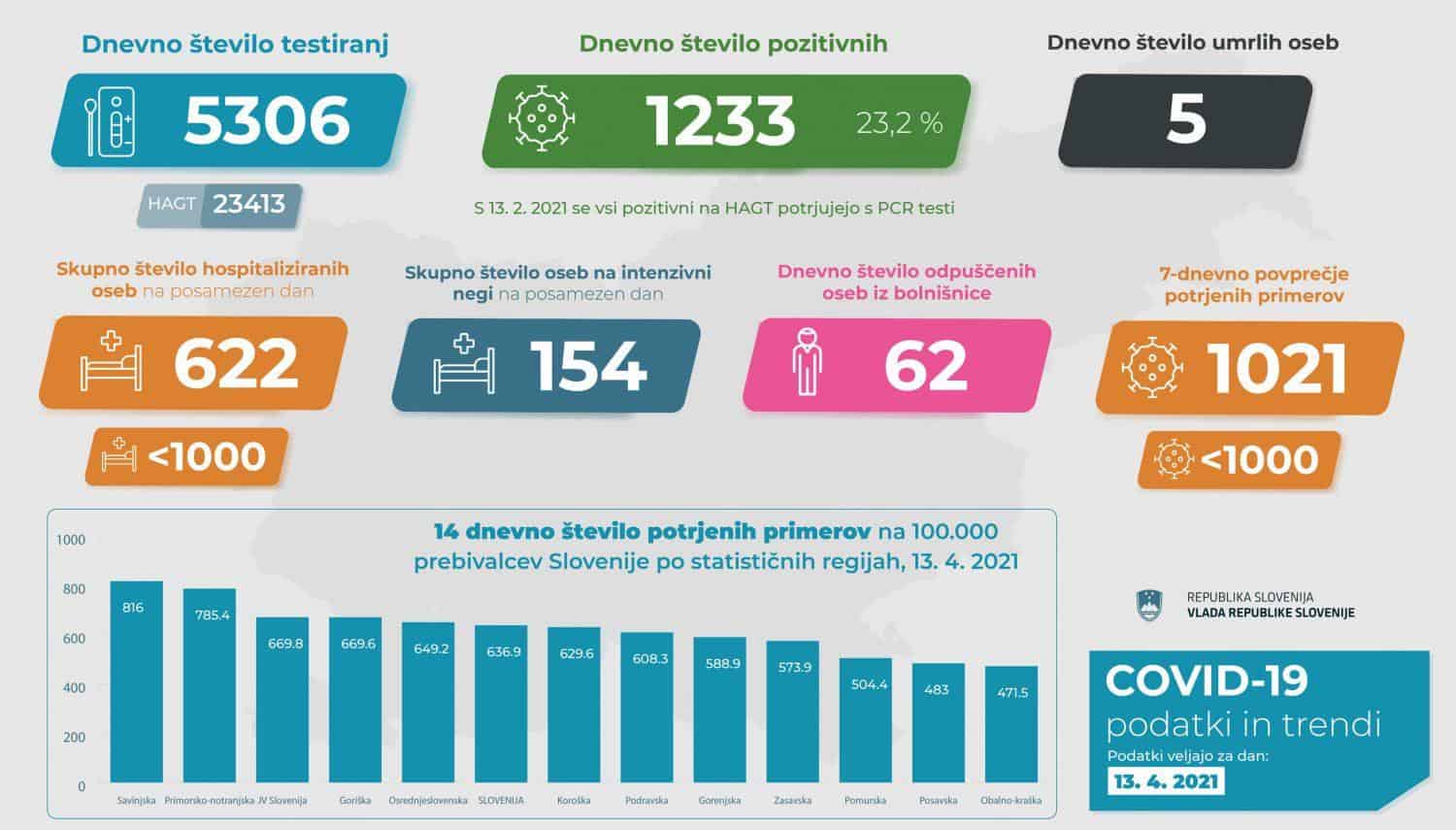 Trend obolelosti s koronavirusom v Sloveniji na dan 13. 4. 2021 (00:00-24:00):