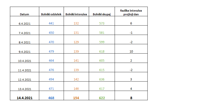 7 dnevno povprečje okužb danes po objavljenih podatkih NIJZ znaša 1021 in je nekoliko višje kot smo poročali včeraj, ko je znašalo 1014. V bolnišnicah se danes zdravi 622 pacientov, 5 več kot včeraj. Na intenzivni terapiji pa se danes zdravi 154 pacientov, včeraj 146. Umrlo je 5 oseb.