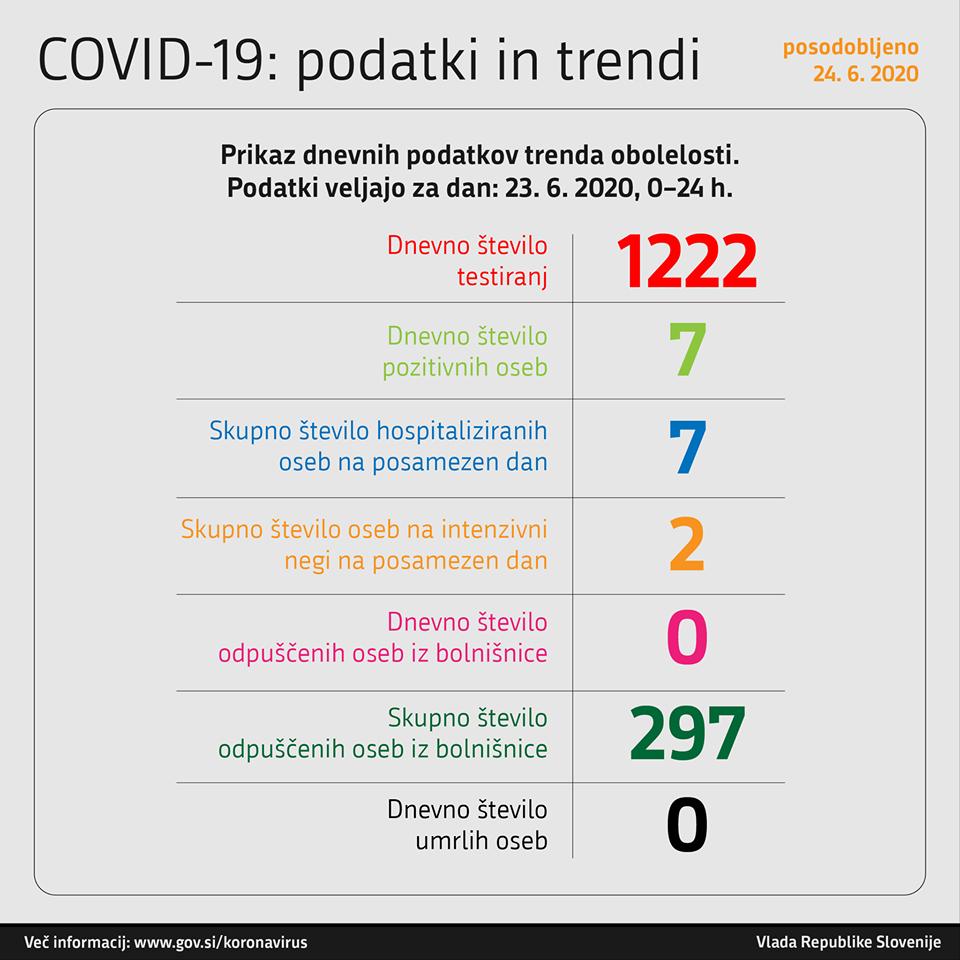 Trend obolelosti s covidom-19 v Sloveniji in podatki za dan 23. 6. 2020 (00:00–24:00):