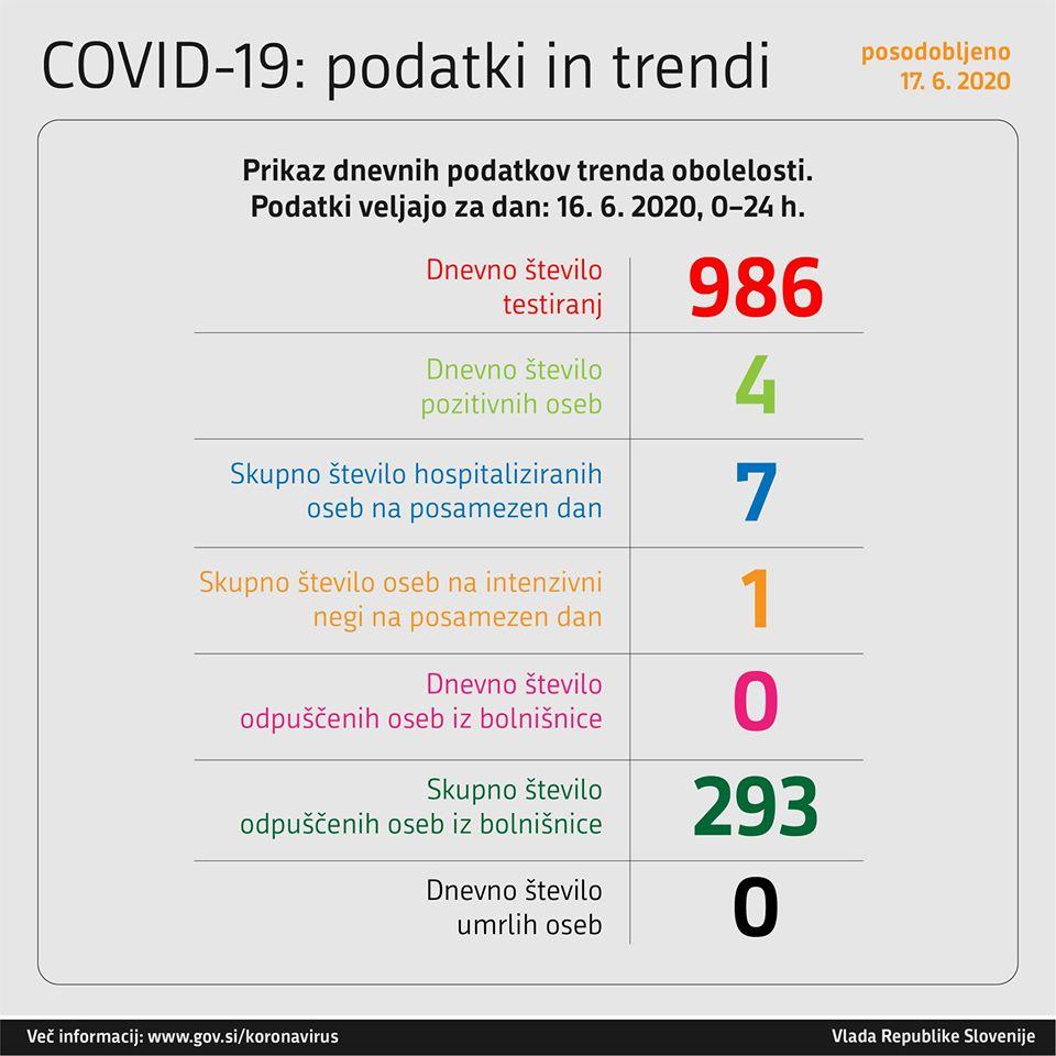 Trend obolelosti s koronavirusom v Sloveniji in podatki za dan 16. 6. 2020 (00:00–24:00):