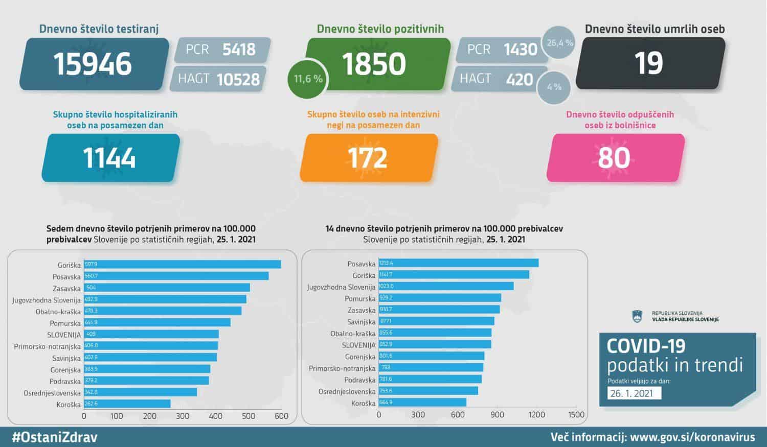 Trend obolelosti s koronavirusom v Sloveniji na dan 26. 1. 2021 (00:00-24:00):