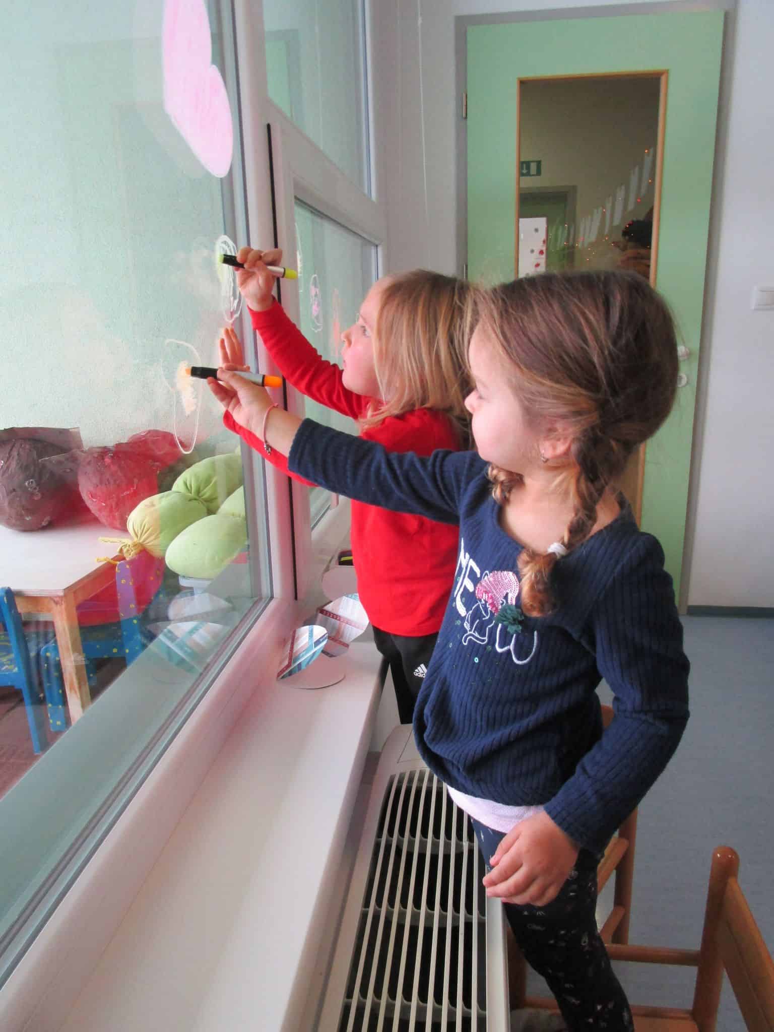 Vrtec je postal pravljičen in skrivnosten z medenim mestom, s snežaki, snežinkami, novoletnimi smrekami in okraski, verigami… Okna igralnic pa so okrasili s srci in s tem širili pomembno sporočilo – da bistvo praznikov ni v darilih, temveč v srčnosti.