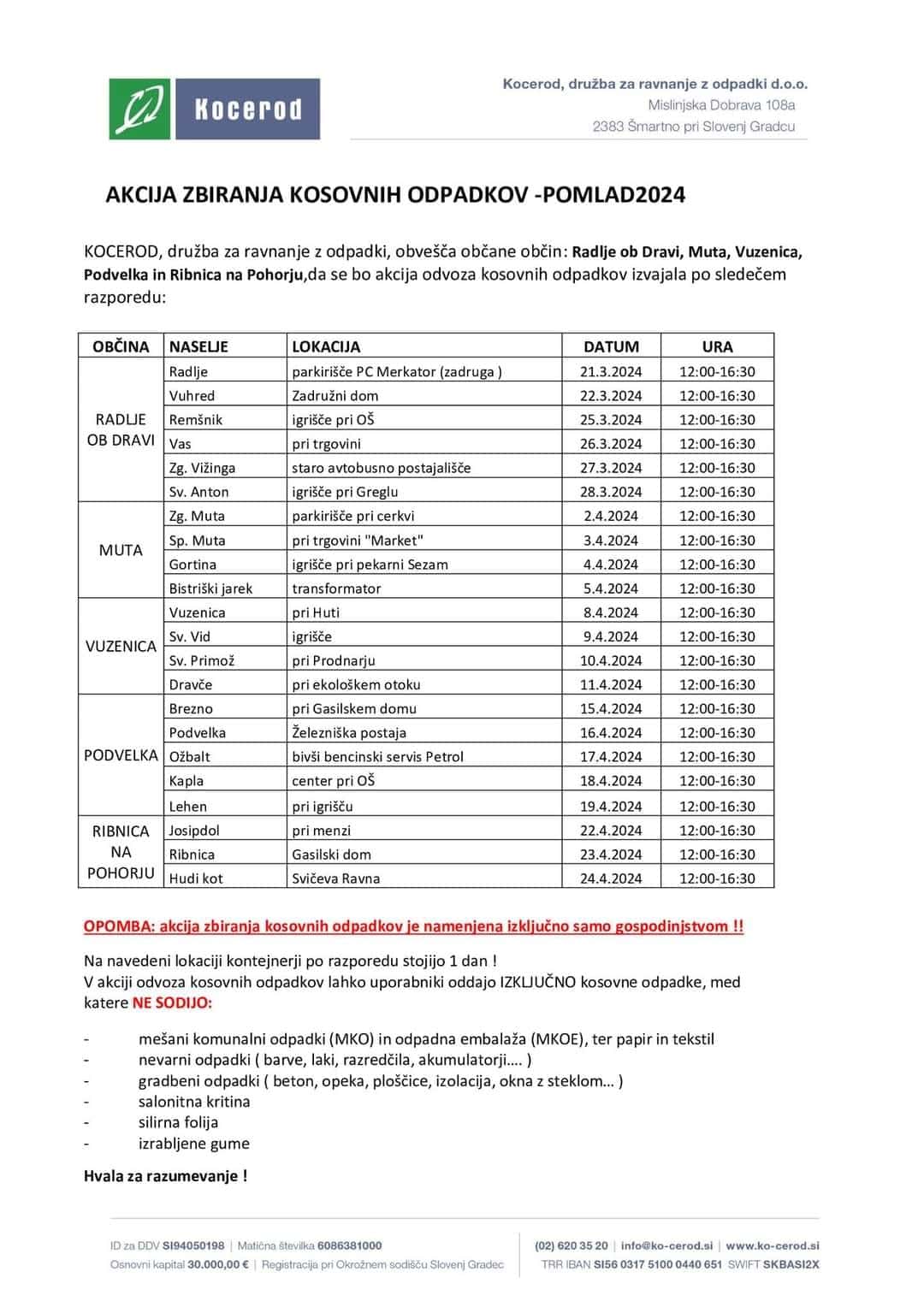 KOCEROD, družba za ravnanje z odpadki, obvešča, da se bo zbiranje kosovnih odpadkov v občini Vuzenica izvajalo po razporedu: