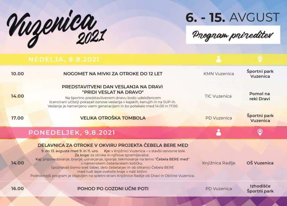 Tudi letošnji Vuzeniški dnevi, ki potekajo pod sloganom ZA VSAKOGAR – TUDI ZA VAS, bodo po besedah organizatorjev polni zabave, športnih dogodkov, družinskih druženj ter kulturnih prireditev. Vsi dogodki so brez vstopnine. Otvorili pa so jih včeraj ob 19. uri v Atriju Župnišča v Vuzenici z nastopom Nuše Derenda, odprtjem razstave kipov Janka Dolenca ob 100. letnici njegovega rojstva in Filatelistično razstavo na temo sokolstva v Vuzenici. Nakar je v Športnem parku Vuzenica sledila še otvoritvena zabava z Dejanom Dogaja in Dogaja bandom ter DJ Ukacom.
