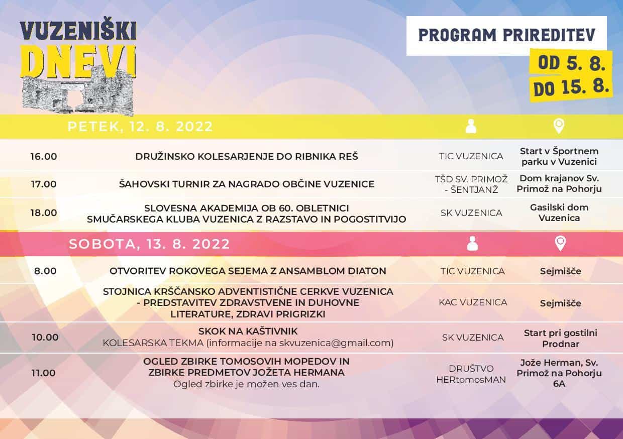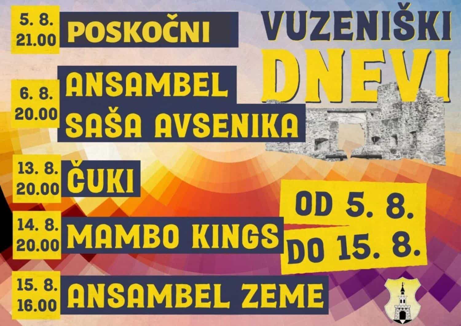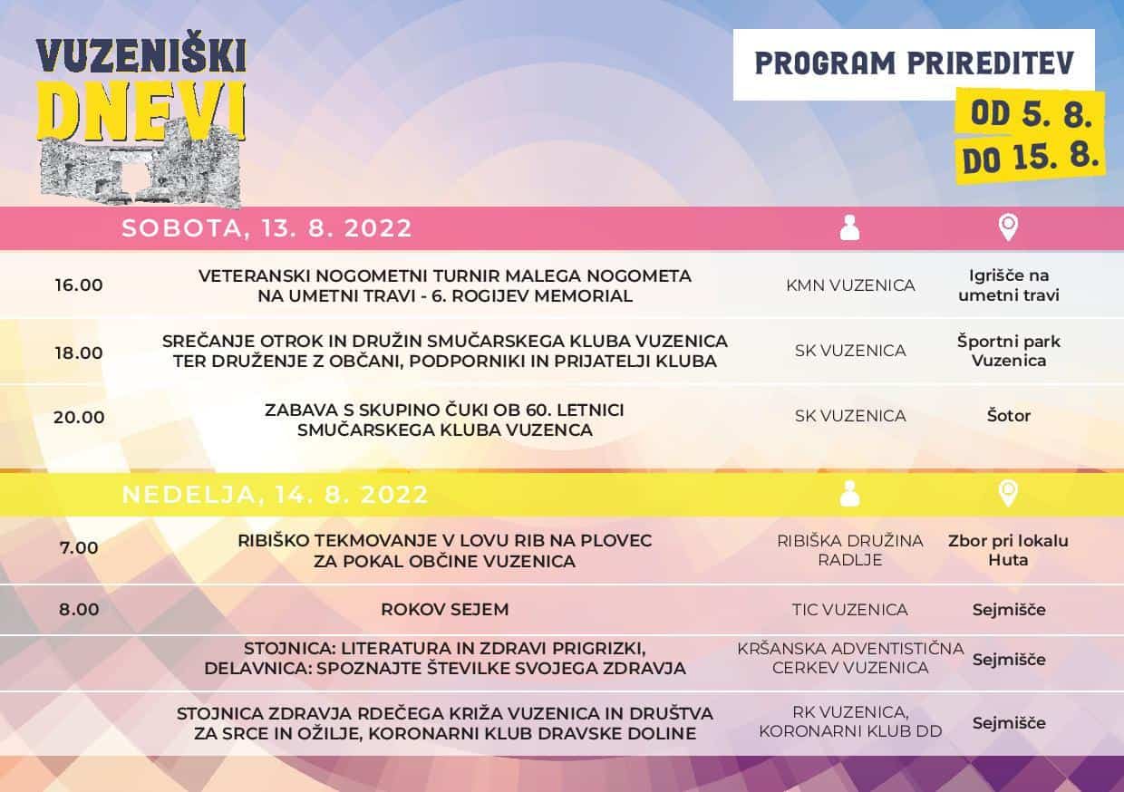 Pri tem naj še omenimo, da bo v Vuzenici veselo in živahno tudi v naslednjih dneh, ko boste lahko med drugim prisluhnili zasedbi Mambo King, ansamblu Zeme, v Vuzenico pa prihajajo tudi Čuki. Po besedah organizatorjev so namreč tudi letošnji Vuzeniški dnevi polni zabave, športnih dogodkov, družinskih druženj ter kulturnih prireditev. Vsi dogodki pa so brez vstopnine.