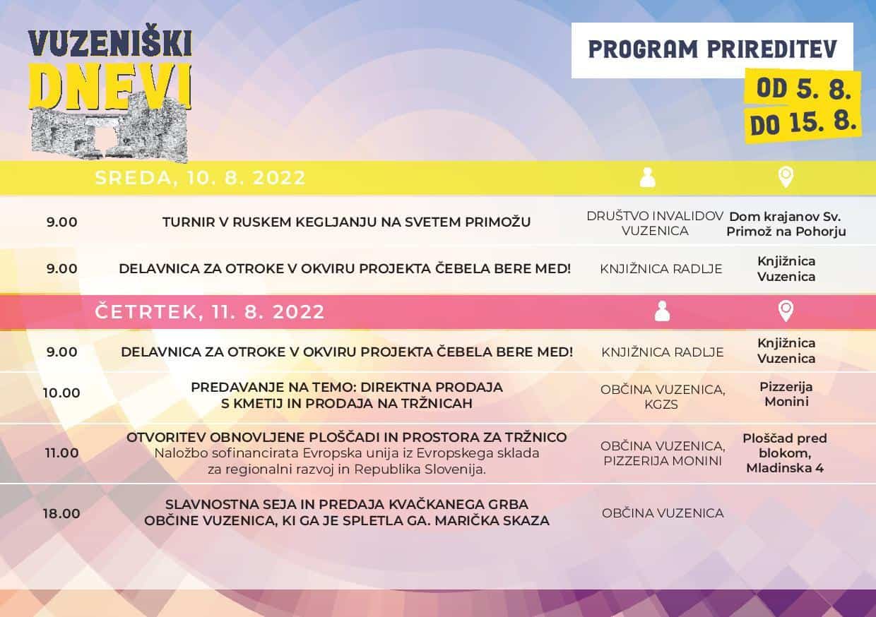 Tudi letošnji Vuzeniški dnevi so postregli z bogatim program, ki se bo v Vuzenici odvil med 5. in 15. avgustom. Po besedah organizatorjev so in še bodo polni zabave, športnih dogodkov, družinskih druženj ter kulturnih prireditev. Vsi dogodki pa so brez vstopnine.