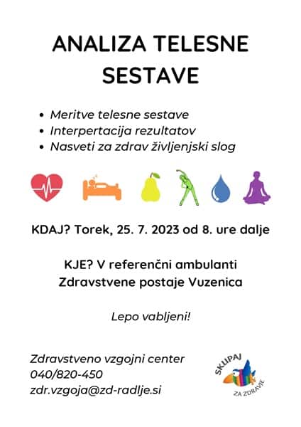 Zdravstveno vzgojni center Zdravstvenega doma Radlje ob Dravi vabi na meritve telesne sestave, ki bo potekala v torek, 25. julija 2023, od 8. ure dalje v referenčni ambulanti ZD Vuzenica.