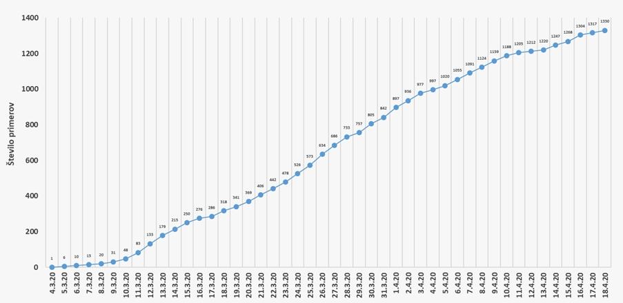 Po podatkih NIJZ 1je bilo do 9. 4. 2020 do 24. ure opravljenih 41.802 testiranj, od tega je bilo 1346 pozitivnih testov.