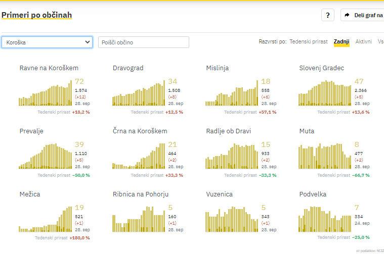 Po oceni Nacionalnega inštituta za javno zdravje (NIJZ) so v državi trenutno 12.804 aktivni primeri okužbe, po podatkih Sledilnika za Covid-19 na Koroškem 296. Največ na Ravnah na Koroškem, kjer jih beležijo 77.