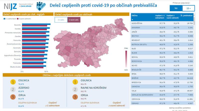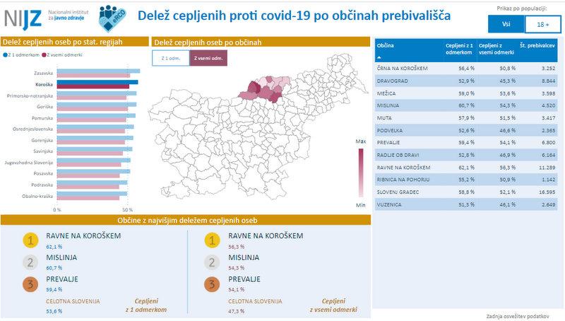 Med koroškimi občinami je največ cepljenih na Ravnah, kjer je z enim odmerkom cepljenih 61,1 odstotek oseb, z vsemi pa 56,3 odstotke.