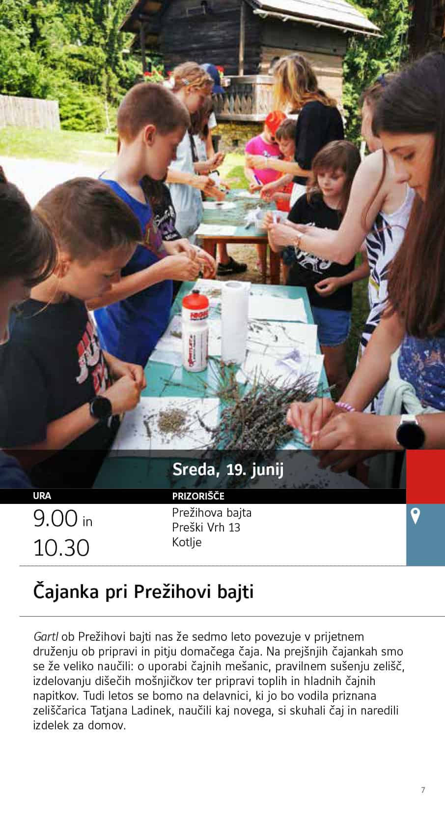 Gartl ob Prežihovi bajti vas že sedmo leto povezuje v prijetnem druženju ob pripravi in pitju domačega čaja. Na prejšnjih čajankah so se že veliko naučili: o uporabi čajnih mešanic, pravilnem sušenju zelišč, izdelovanju dišečih mošnjičkov ter pripravi toplih in hladnih čajnih napitkov.