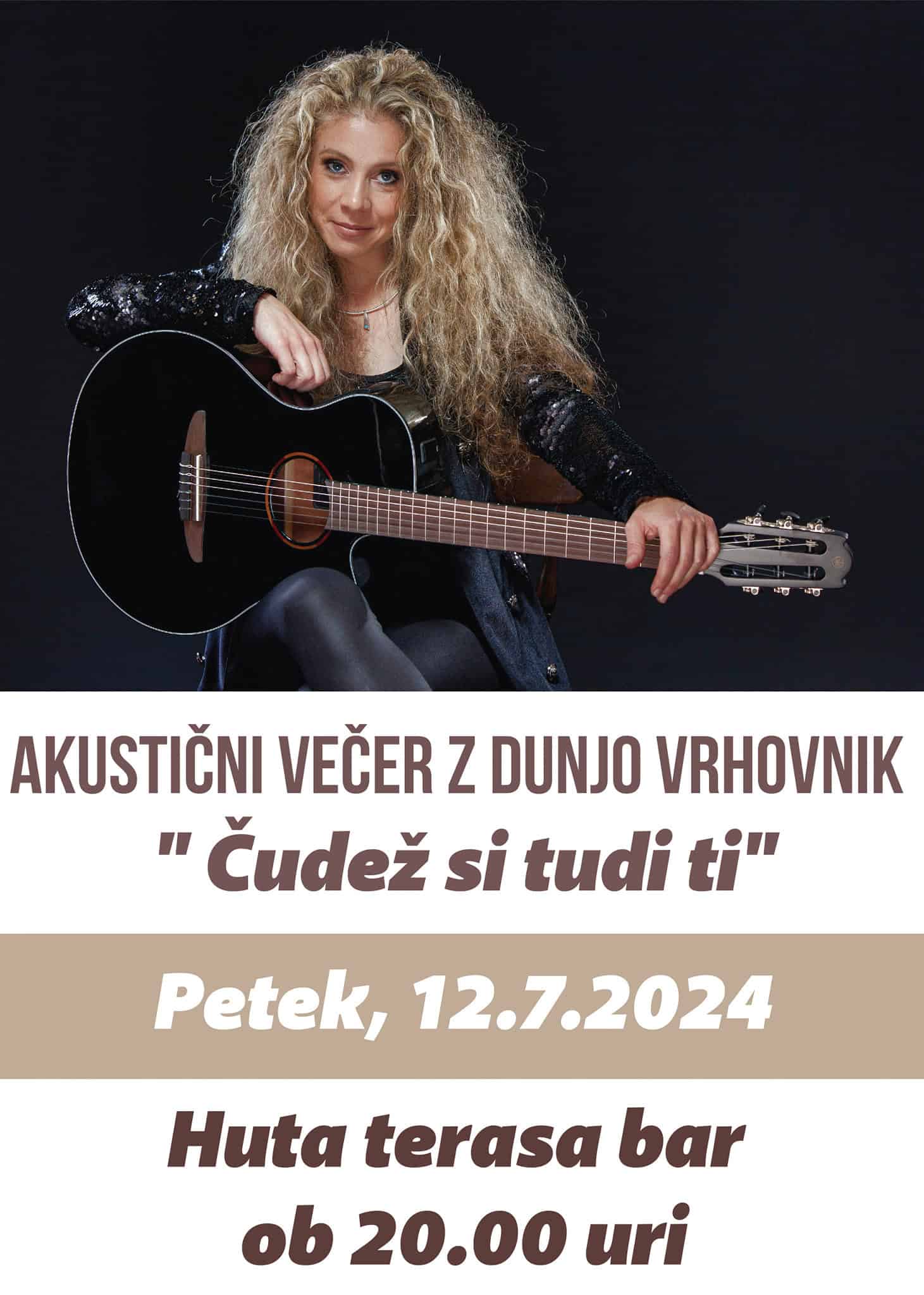 V petek, 12. julija 2024, ob 20. uri, se bo v Vuzenici odvijal poseben glasbeno obarvani večer. Za imenitno vzdušje na terasi Huta bara bo poskrbela karizmatična Dunja Vrhovnik.