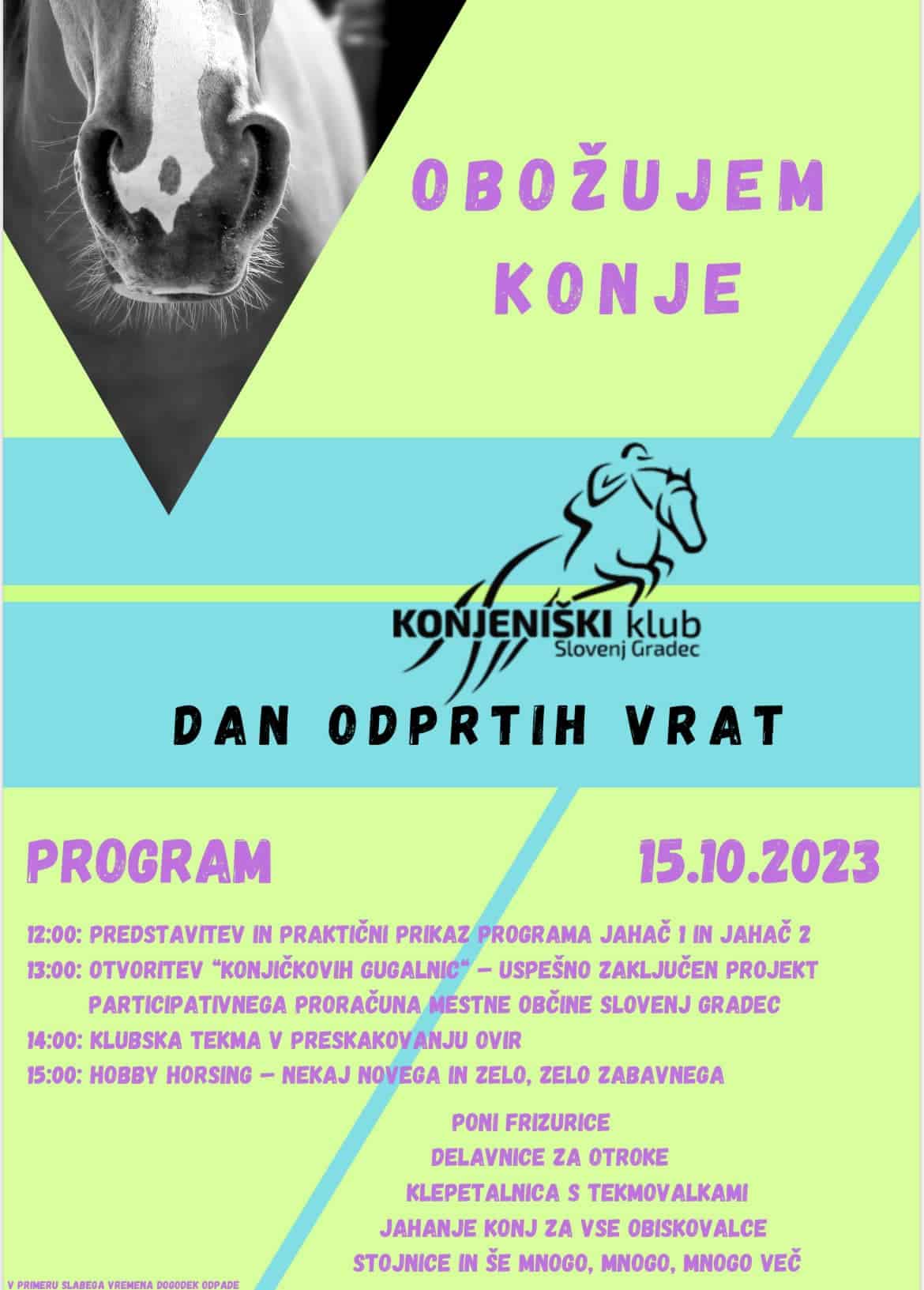 V nedeljo, 15. oktobra 2023, od 12. ure, vabljeni v Mislinjsko Dobravo na prireditev Obožujem konje, dan odprtih vrat Konjeniškega kluba Slovenj Gradec, ki bo letos še bolj atraktiven od lanskega.