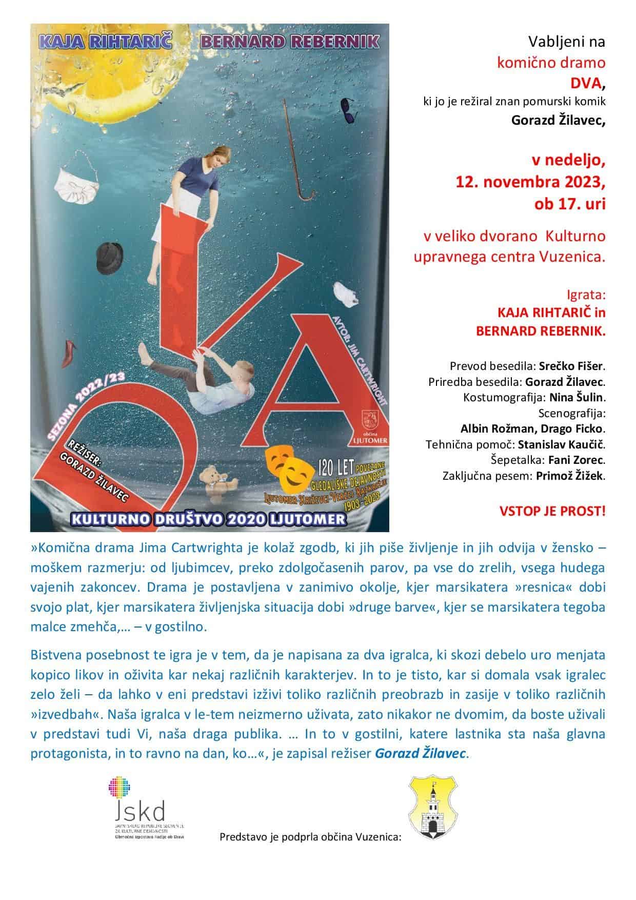 V nedeljo, 12. novembra 2023, ob 17. uri, si lahko v Vuzenici (velika dvorana tamkajšnjega Kulturno upravnega centra), ogledate komično dramo Jima Cartwrighta. Vstop je prost.