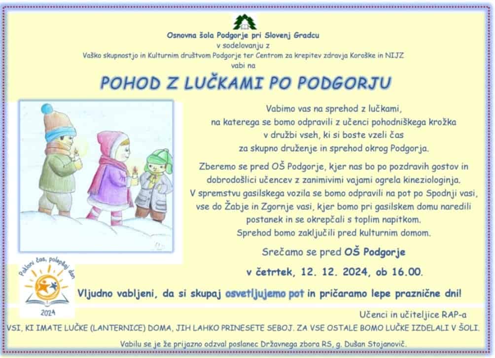 Osnovna šola Podgorje pri Slovenj Gradcu v sodelovanju z Vaško skupnostjo, Kulturnim društvom Podgorje, Centrom za krepitev zdravja Koroške in NIJZ vabi na praznično obarvan dogodek Pohod z lučkami po Podgorju.