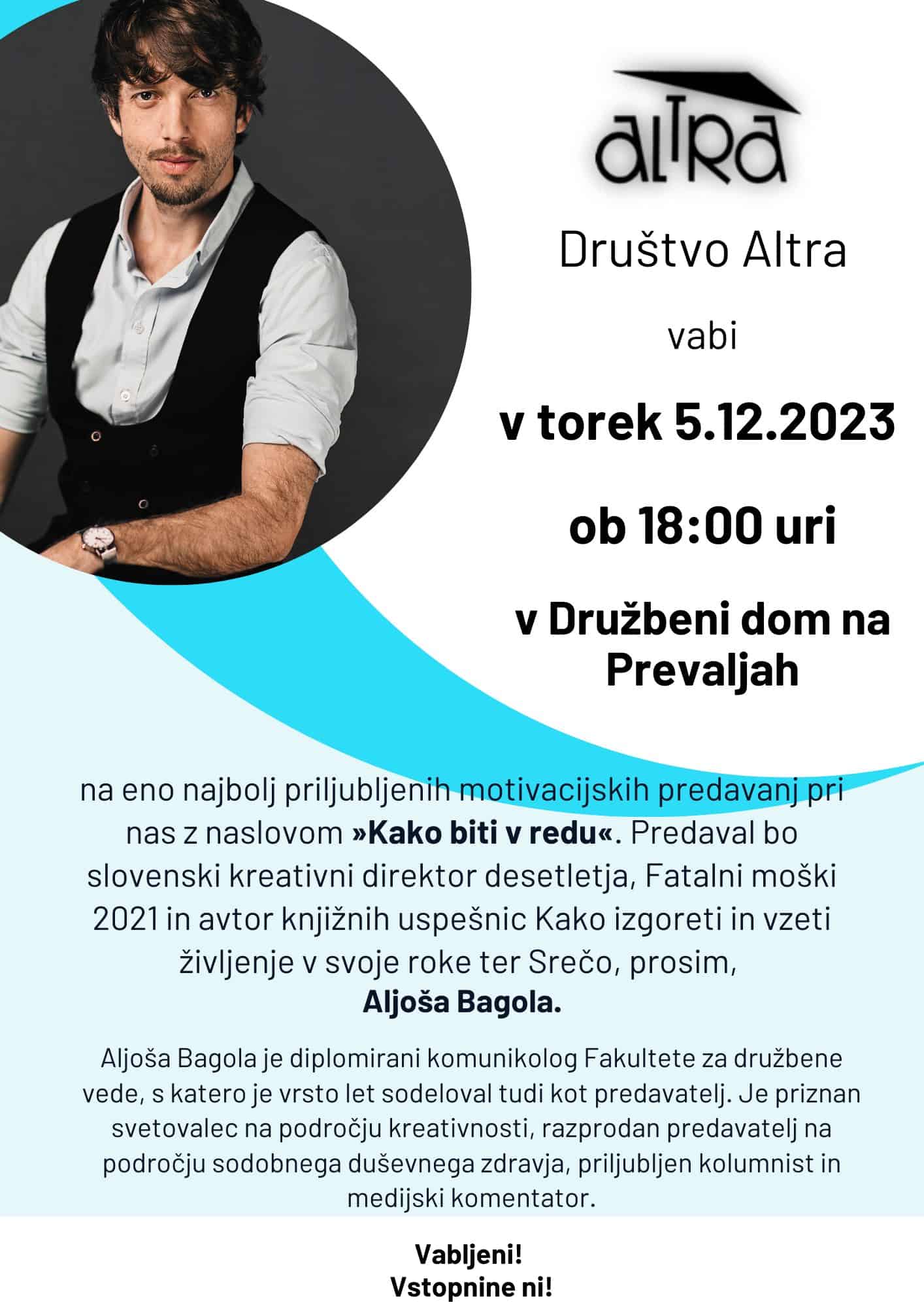 Društvo Altra, Enota Prevalje, s ponosom vabi vse zainteresirane na eno izmed najbolj priljubljenih motivacijskih predavanj pri nas. Dogodek bo potekal v torek, 5. decembra 2023, s pričetkom ob 18:00 uri v Družbenem domu na Prevaljah.