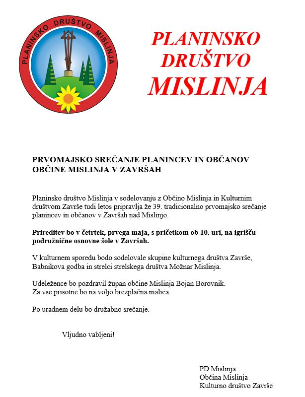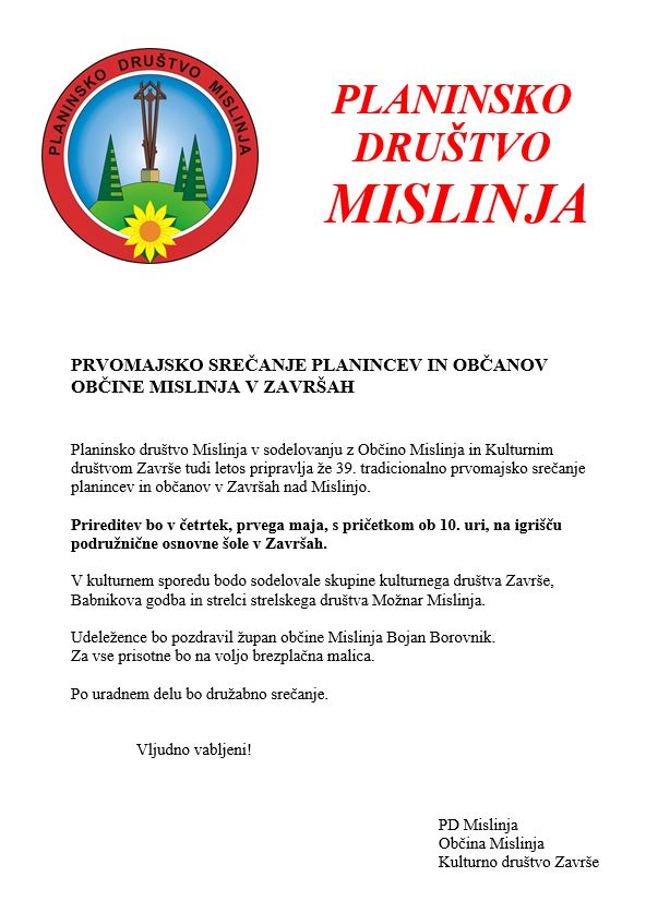 Planinsko društvo v sodelovanju z Občino Mislinjo in Kulturnim društvom Završe vabi vse občane in ljubitelje narave na že 39. tradicionalno prvomajsko srečanje v Završah nad Mislinjo, ki bo potekalo v četrtek, 1. maja 2025, ob 10. uri na igrišču podružnične osnovne šole v Završah.