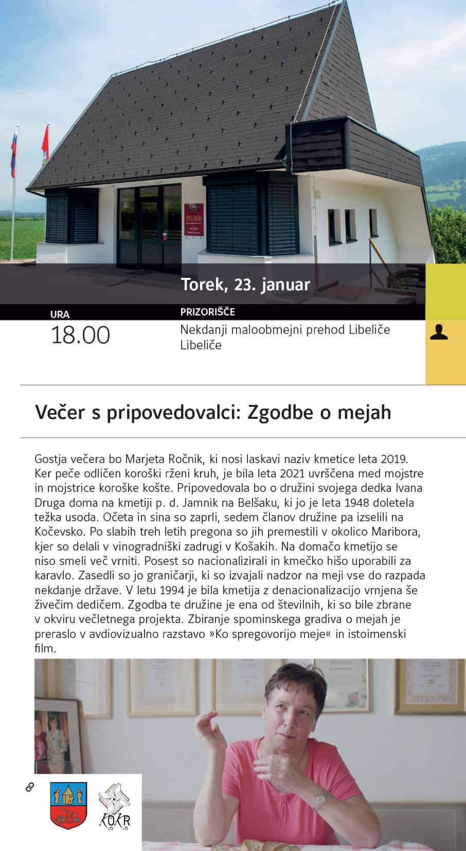 Koroški pokrajinski muzej, Muzej Slovenj Gradec in Kulturno prosvetno društvo Libeliče vas v torek, 23. januarja 2024, ob 18. uri vabita na nekdanji maloobmejni prehod Libeliče na Večer s pripovedovalci: Zgodbe o mejah.