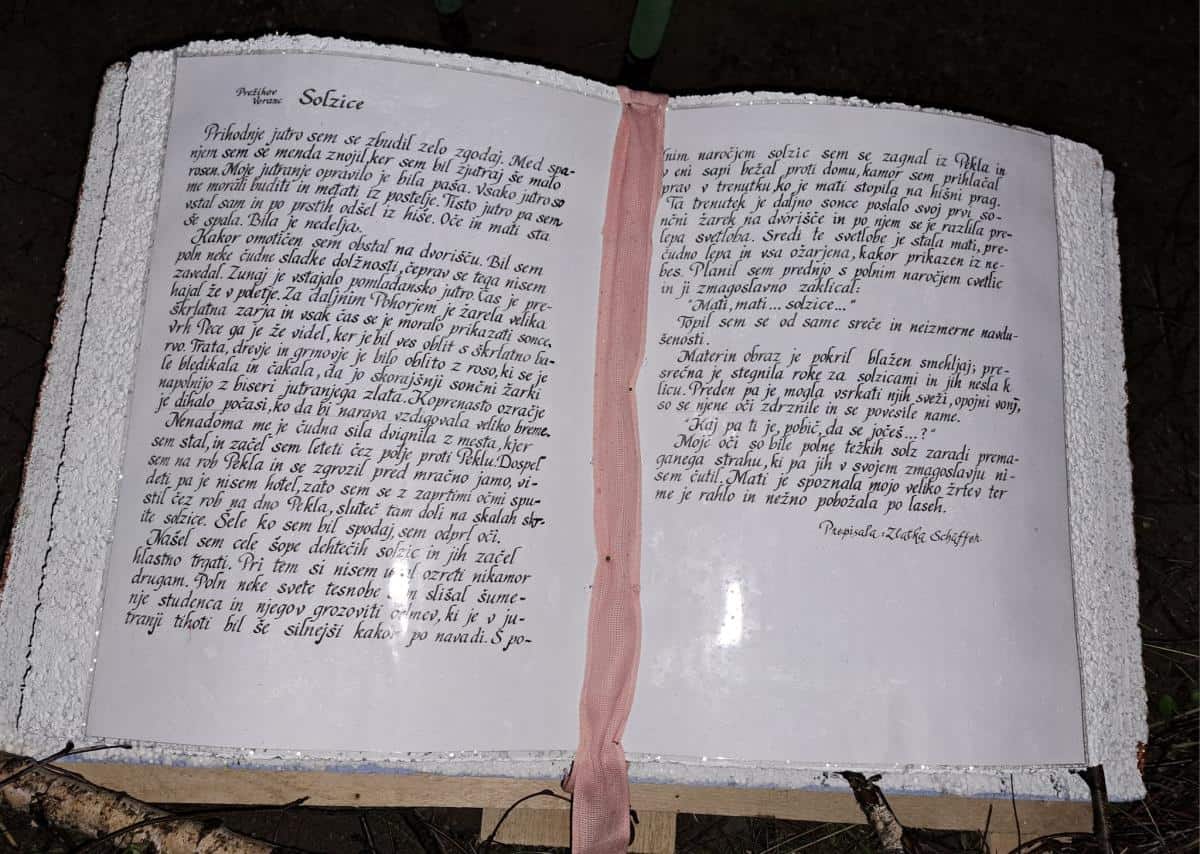 Velik pušlc solzic in knjiga, ki na svojih belih listih s kaligrafsko pisavo upodablja pisateljevo črtico Solzice.