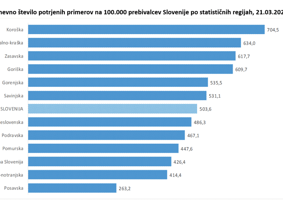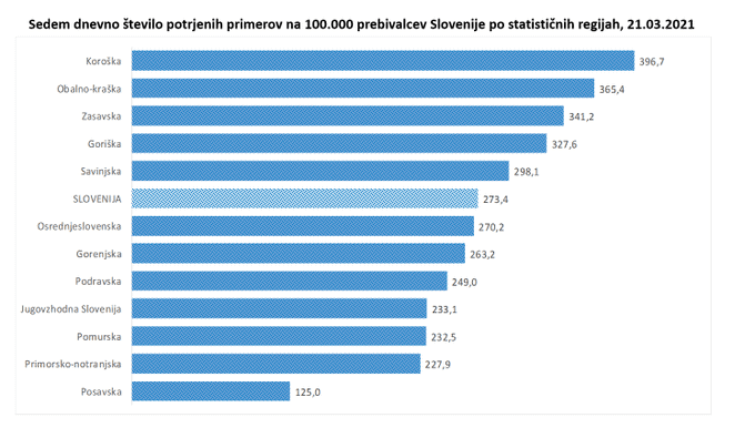 Maja Bratuša je pojasnila, da 14 dnevno število potrjenih primerov na 100.000 prebivalcev na ravni države znaša 504, kar pomeni, da smo ponovno presegli mejnik 500. Najvišja 14-dnevna incidenca znaša v koroški regiji, kjer znaša 704,5, sledita obalno-kraška in zasavska regija. Tudi 7-dnevno število potrjenih primerov na 100.000 prebivalcev na ravni države se povišuje. Na ravni države znaša 273,4, tudi pri tem indikatorju je koroška regija tista, ki ima najvišjo incidenco, znaša 396,7, sledi obalno-kraška regija.