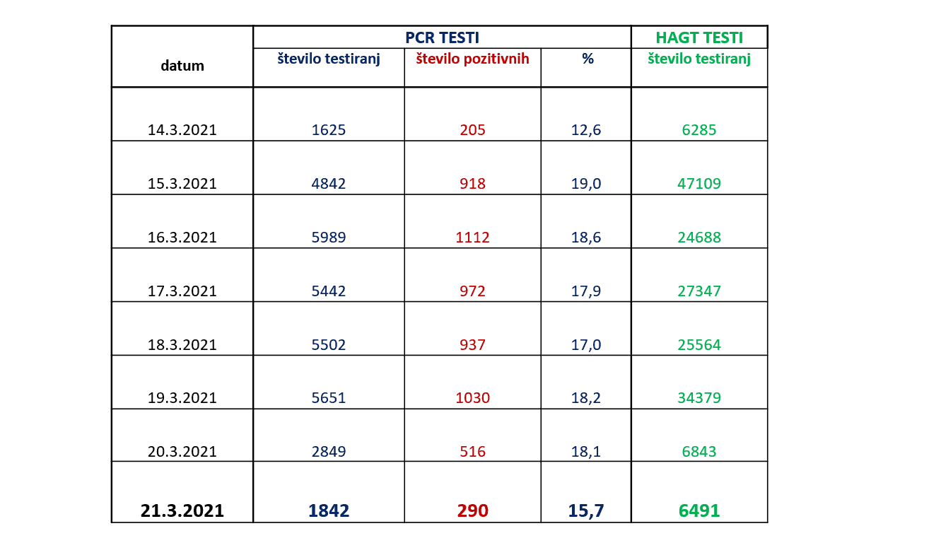 Kot je pojasnila Maja Bratuša je bilo včeraj opravljenih 1.842 PCR testov in 6.491 hitrih antigenskih testov. S PCR testi je bilo včeraj potrjenih 290 novih okužb. Ob tem je pojasnila, da kljub temu, da je ob nedeljah navadno opravljenih manj testov in potrjenih manj okužb kot čez teden nekaj občin glede na včeraj potrjene okužbe izstopajo naslednje občine: Kranj 11, Kamnik 20, Ljubljana 19, Maribor 42.