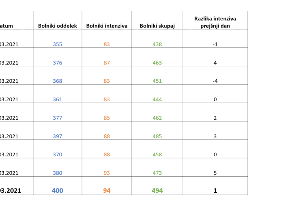 Žal se ponovno povečuje tudi število oseb, ki potrebujejo bolnišnično oskrbo. V bolnišnicah se danes tako zdravi 494 pacientov, včeraj je bolnišnično oskrbo potrebovalo 473, v soboto 458 oseb. Čez vikend je bilo v bolnišnice zaradi covida-19 sprejetih 82 pacientov, 43 v nedeljo in 39 v soboto. Iz bolnišnic je bilo v nedeljo odpuščenih 18 pacientov, v soboto pa 19. Umrli so štirje covidni bolniki.