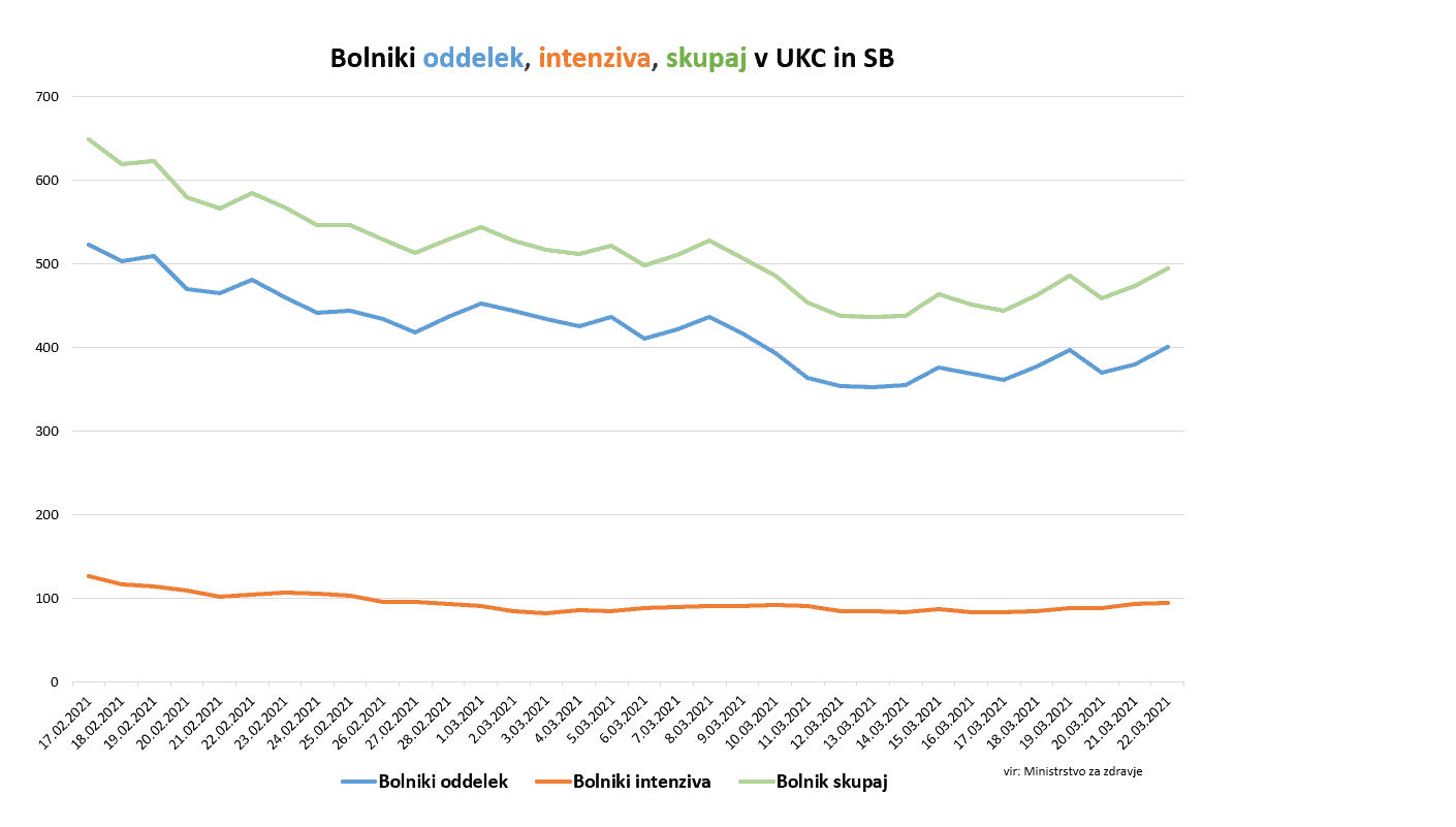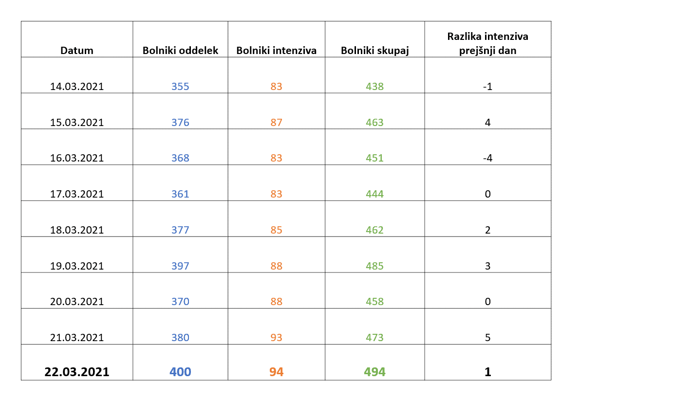 Žal se ponovno povečuje tudi število oseb, ki potrebujejo bolnišnično oskrbo. V bolnišnicah se danes tako zdravi 494 pacientov, včeraj je bolnišnično oskrbo potrebovalo 473, v soboto 458 oseb. Čez vikend je bilo v bolnišnice zaradi covida-19 sprejetih 82 pacientov, 43 v nedeljo in 39 v soboto. Iz bolnišnic je bilo v nedeljo odpuščenih 18 pacientov, v soboto pa 19. Umrli so štirje covidni bolniki.