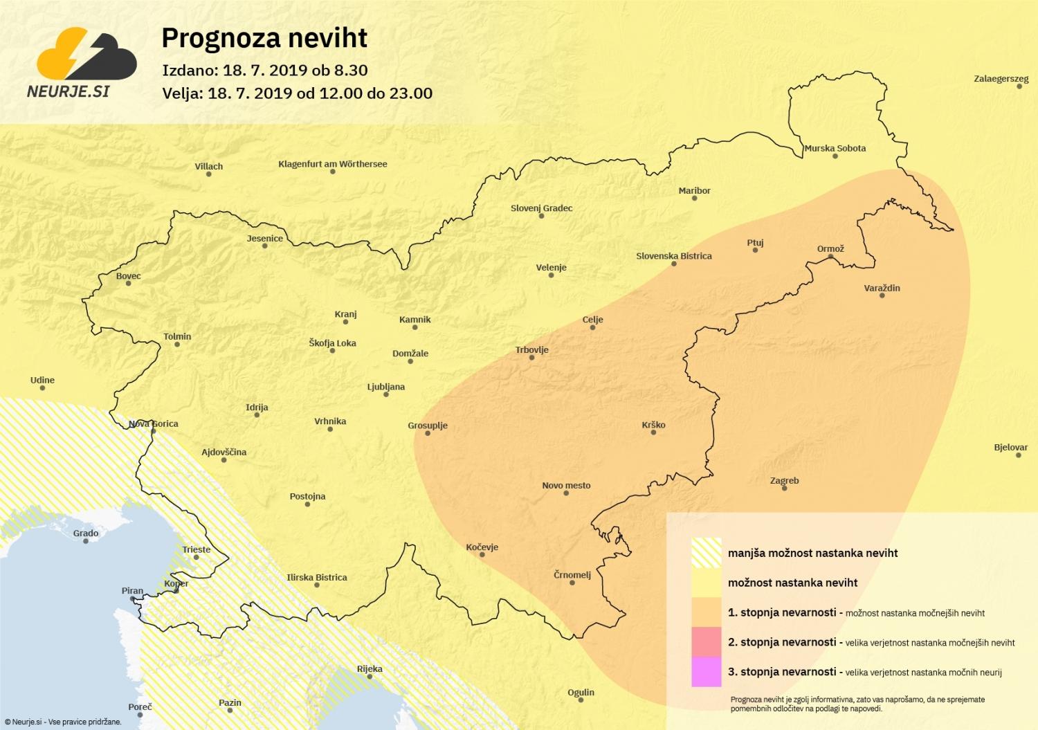 Najmanj možnosti za nastanek neviht je na Primorskem, predvsem ob obali. Zaradi šibkih vetrov v višinah bo premikanje neviht počasno, nastajale bodo večinoma večcelične (sprva tudi stacionarne) nevihte. Zaradi večje zaloge razpoložljive konvektivne potencialne energije na vzhodu in jugovzhodu države (do 1200 J/kg), je predvsem tam večja verjetnost za kakšno močnejšo nevihto. Možni so močnejši in dolgotrajnejši nalivi, močnejši sunki nevihtnega piša ter drobna toča. Zvečer in v noči na petek se bo ozračje postopno umirilo.