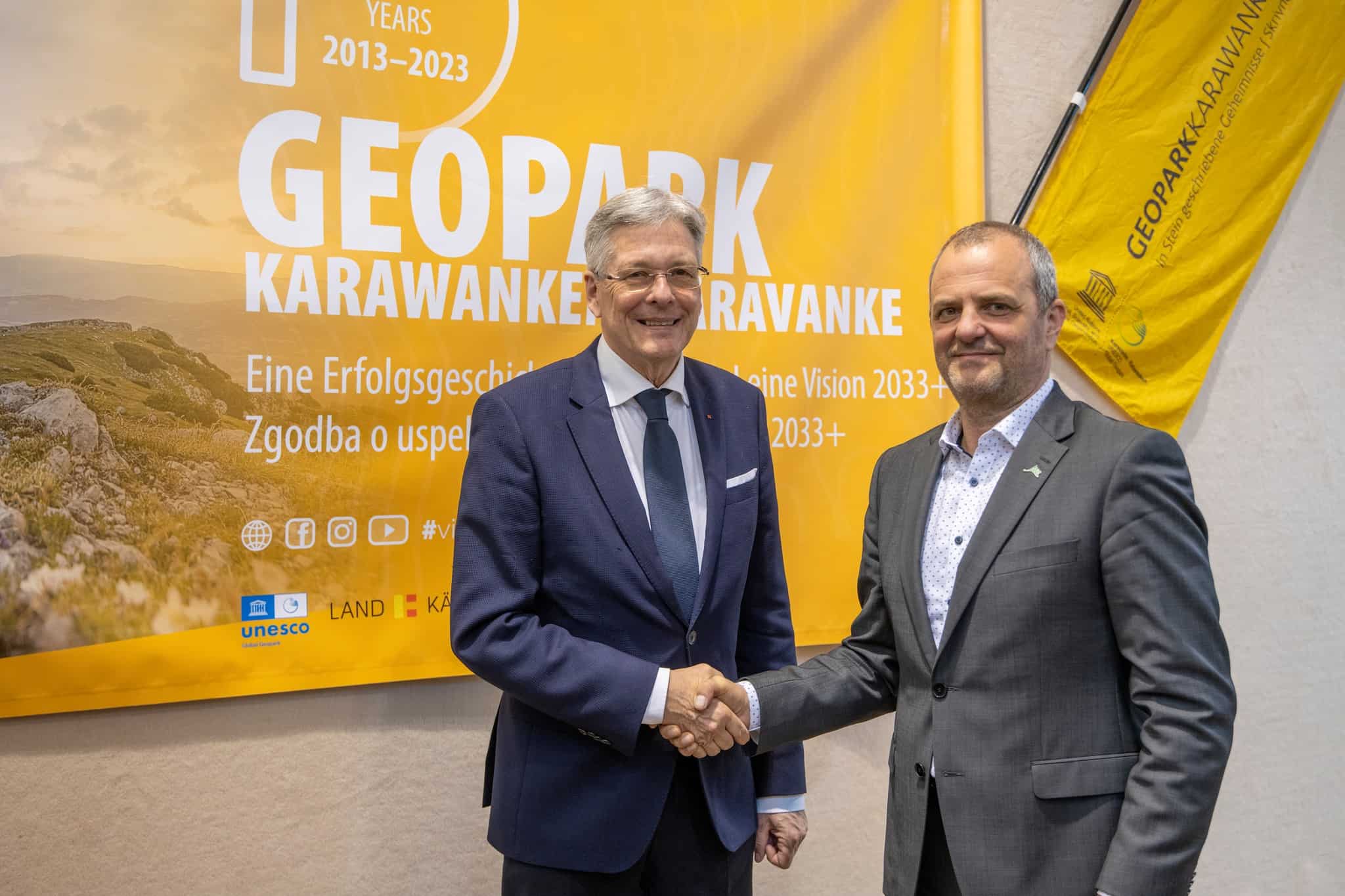 Nekdanja predsednika Gerhard Visotschnig in Dušan Krebel sta prisotnim predstavila bilanco geoparka v zadnjih desetih letih, pri čemer je bilo izvedenih projektov za kar 10 milijonov evrov.