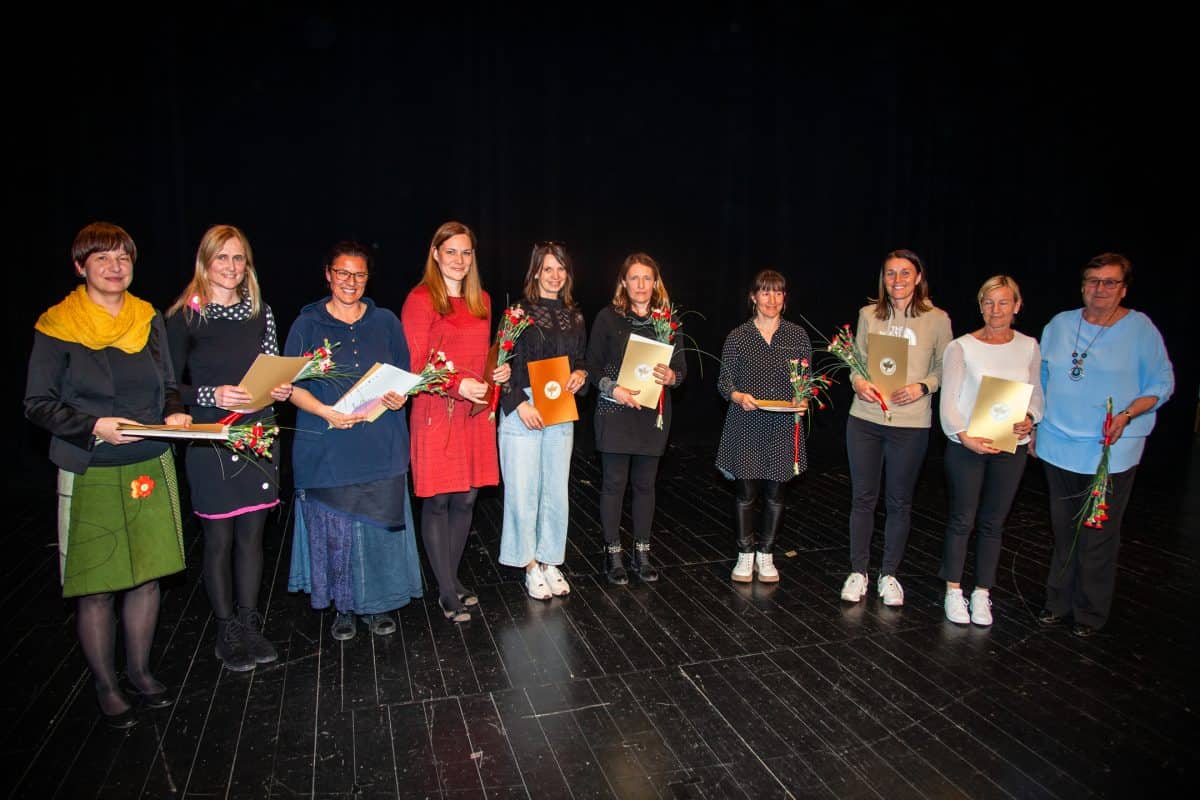 Na fotografiji so vodje nastopajočih skupin in avtorice odrskih postavitev z vodjo JSKD OI Ravne na Koroškem.