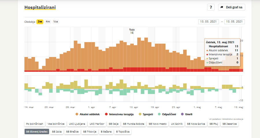 V Splošni bolnišnici Slovenj Gradec se po zadnjih podatkih Covid-19 sledilnika zdravi 13 covidnih bolnikov, dva na oddelku intenzivne terapije. V bolnišnično oskrbo so sprejeli enega bolnika. Nihče ni umrl.
