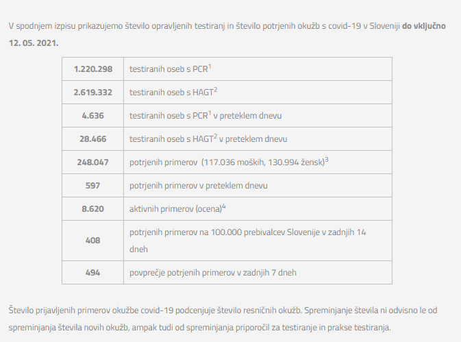 Število opravljenih testiranj in število potrjenih okužb s covidom-19 do vključno 12. 5. 2021: