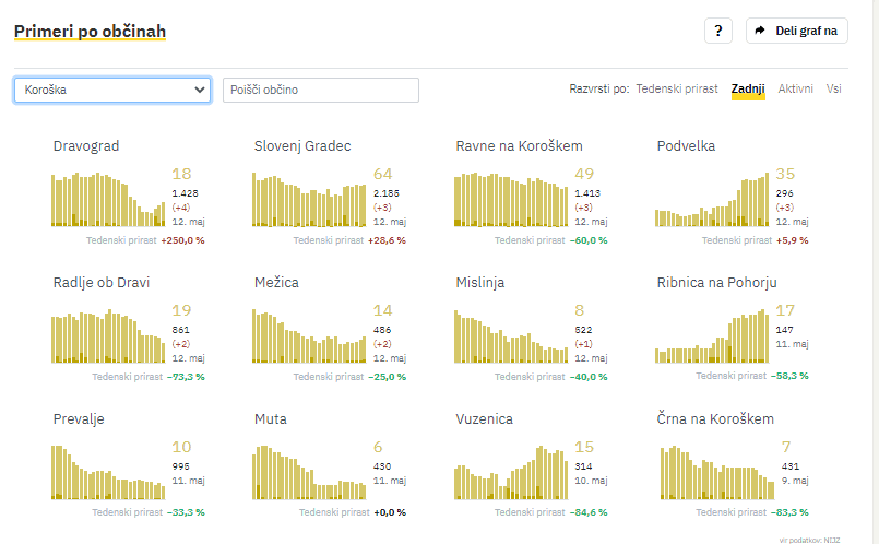 Dravograd 4, Slovenj Gradec 3, Ravne na Koroškem 3, Podvelka 3, Radlje ob Dravi 2, Mežica 2, Mislinja 1.