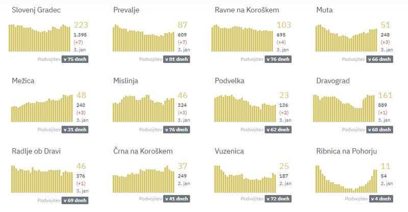 Na Koroškem so včeraj največ novih okužb zabeležili v Slovenj Gradcu in na Prevaljah, kjer so jih potrdili po 7. Na Ravnah na Koroškem so potrdili 4 nove okužbe, na Muti, v Podvelki in Mežici po 3, v Podvelki 2, v Radljah ob Dravi in v Dravogradu pa po 1.