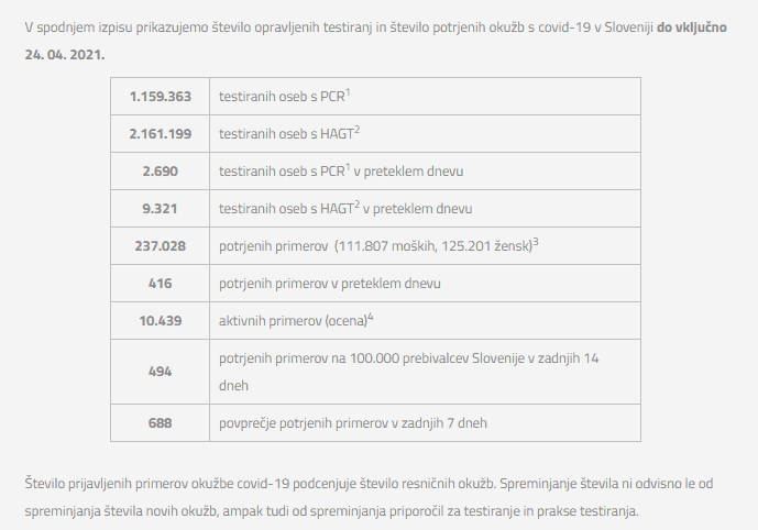Število opravljenih testiranj in število potrjenih okužb s covidom-19 do vključno 24. 4. 2021.