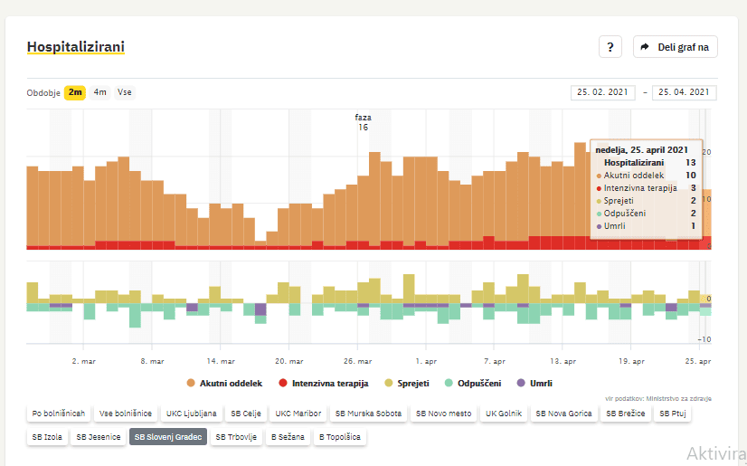 V Splošni bolnišnici Slovenj Gradec se po zadnjih podatkih Covid-19 sledilnika zdravi 13 covidnih bolnikov, trije na oddelku intenzivne terapije. V bolnico so sprejeli dve osebi, tudi v domačo oskrbo so odpustili dve osebi s potrjeno koronavirusno okužbo. Umrla je ena oseba s covidom-19.