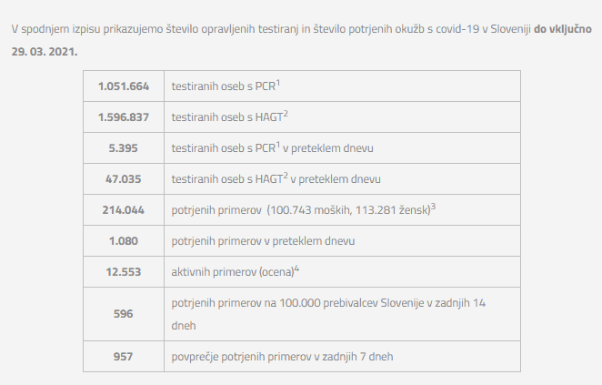 Število opravljenih testiranj in število potrjenih okužb do vključno 29. 3. 2021.