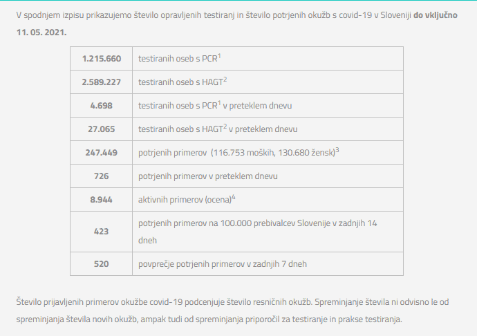 Število opravljenih testiranj in število potrjenih okužb s covidom-19 do vključno 11. 5. 2021: